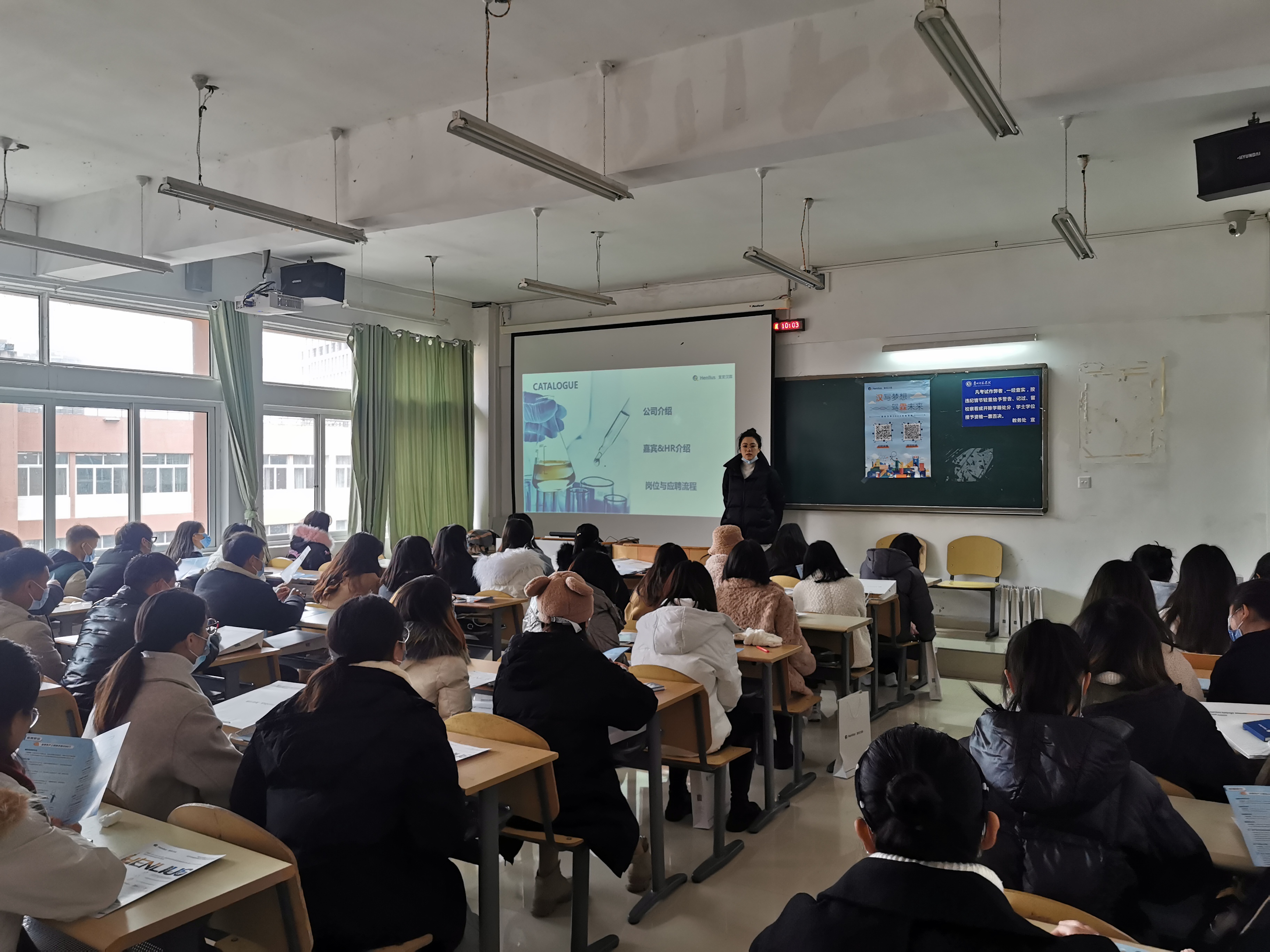 此次招聘会以讲座的形式召开,主讲人李扬介绍了公司的基本概况和招聘岗位:细胞培养技术员、纯化技术员、制剂技术员、生产支持工程师、QC研究员等等,详细向同学们介绍各招聘岗位的需求,并耐心解答同学们的疑惑。公司员工积极参加投递简历、宣讲、面试等环节,与上海复宏汉霖生物技术有限公司达成初步意向约30人。