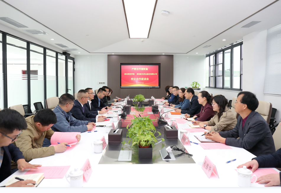 石培新介绍我校概况,并从三个层面指出此次走访调研的目的。一是贯彻落实教育部、省教育厅开展的全国高校书记董事长访企拓岗促就业专项行动,全力促进公司毕业生高质量充分就业;二是听取企业对公司实习生、就业毕业生职业素养、专业能力等方面的反馈意见和对就业工作的意见建议,进一步提高人才培养质量;三是以新国发2号文件为契机,充分发挥区位上的“近邻”优势,在人才培养、党史党建、成果转化、康养结合、公司产品、科学研究等方面开展深入合作与交流,促进双方互利共赢、协同发展,为我省围绕“四新”主攻“四化”献力,为“强省会”战略助力,以敢闯敢干的姿态奋力谱写多彩贵州现代化建设新篇章。