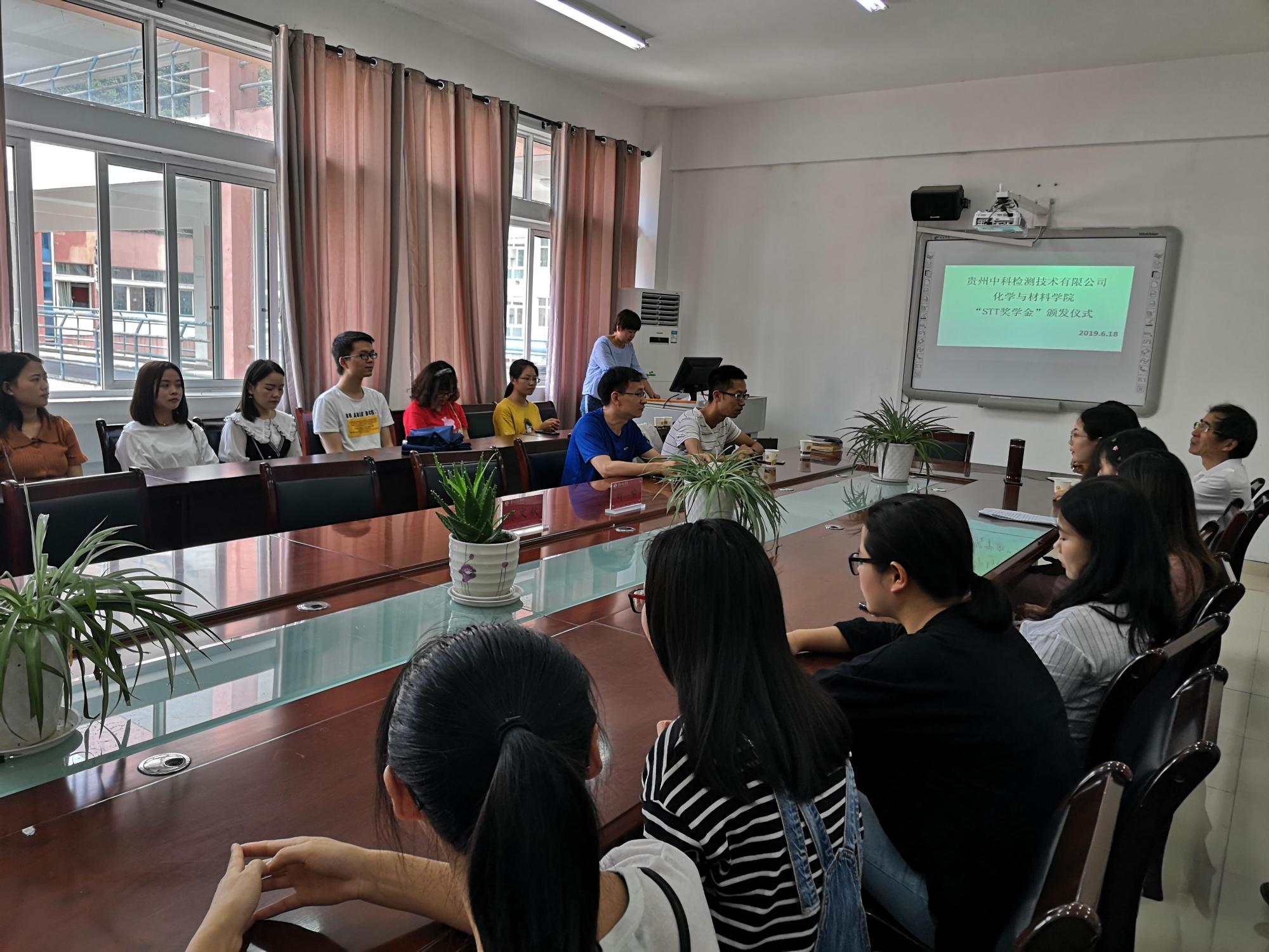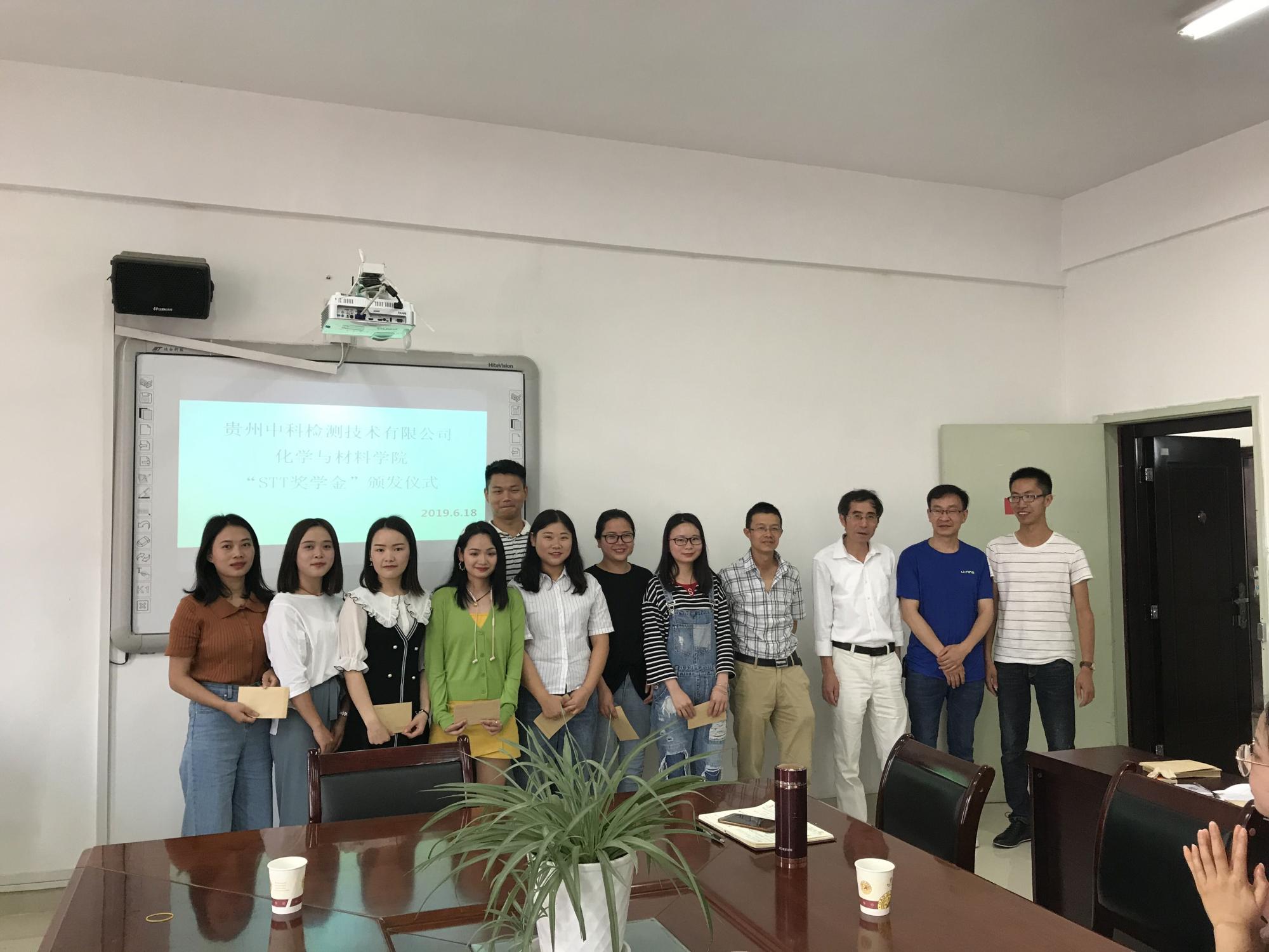 6月18日,化学与材公司2019届“STT奖学金”颁发仪式在宁静楼525举行。“STT奖学金”是由贵州中科检测技术有限公司与美加墨世界杯官方网站联合,为激励员工勤奋学习、努力进取,促进员工德、智、体、美等方面全面发展,鼓励员工积极参与实习实践,用于奖励优秀实习员工。参加仪式的有中科公司总监王瑞平,总监王勋,总监侯雨,化材公司党委副书记、经理宋万琚,实践教学管理负责人李艳莹,高级实验师李小平及2019届优秀毕业实习生。仪式由李艳莹主持。