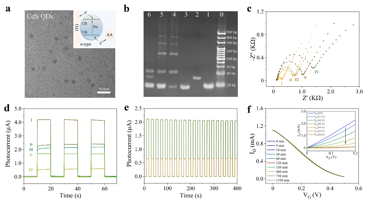图2. CdS QDs的TEM表征及相关电荷转移机理图;DNA超结构及ATP刺激释放响应过程的凝胶电泳表征;DNA超结构及ATP刺激释放响应过程的电化学阻抗表征;DNA超结构及ATP刺激释放响应过程的光电化学测试表征;ATP刺激释放响应DNA超结构前后的光电流稳定性;OECT器件的稳定性表征。