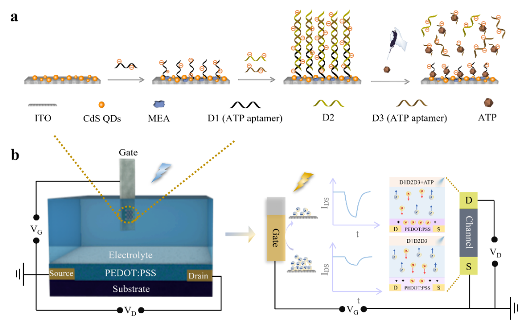 如图1所示,在CdS QDs/ITO栅电极上建立了具有高负电荷的超分子DNA结构通过酰胺化将5′-胺化的DNA 1 (ATP aptamer,记为D1) 功能化到羧化的CdS量子点上,随后的DNA自组装在特定区域部分识别的重复序列DNA 2 (记为D2) 和DNA 3 (ATP aptamer,记为D3)。经过ATP处理将解离连接的DNA链,释放D2和D3,极大地降低了负电荷密度同时使得 (3,4乙二氧基噻吩基):聚(苯乙烯磺酸)(PEDOT:PSS) 通道在光照下具有良好的传输特性。开发的新型有机光电化员工物传感系统不仅完成了光电接口与靶标相关的超灵敏度调谐,而且还将成为未来OPECT调控和操作的一种新型传感分析方法。