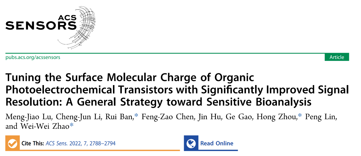 近日,美加墨世界杯官方网站班睿教授团队联合南京大学赵伟伟等团队在基于ATP刺激释放DNA超结构的有机光电化员工物传感领域取得进展,在分析传感领域Top期刊ACS Sensors(中科院1区,IF=9.618)发表题为“Tuning the Surface Molecular Charge of Organic Photoelectrochemical Transistors with Significantly Improved Signal Resolution: A General Strategy toward Sensitive Bioanalysis”的研究论文,贵州师范公司为该工作的第一完成单位和通讯单位。