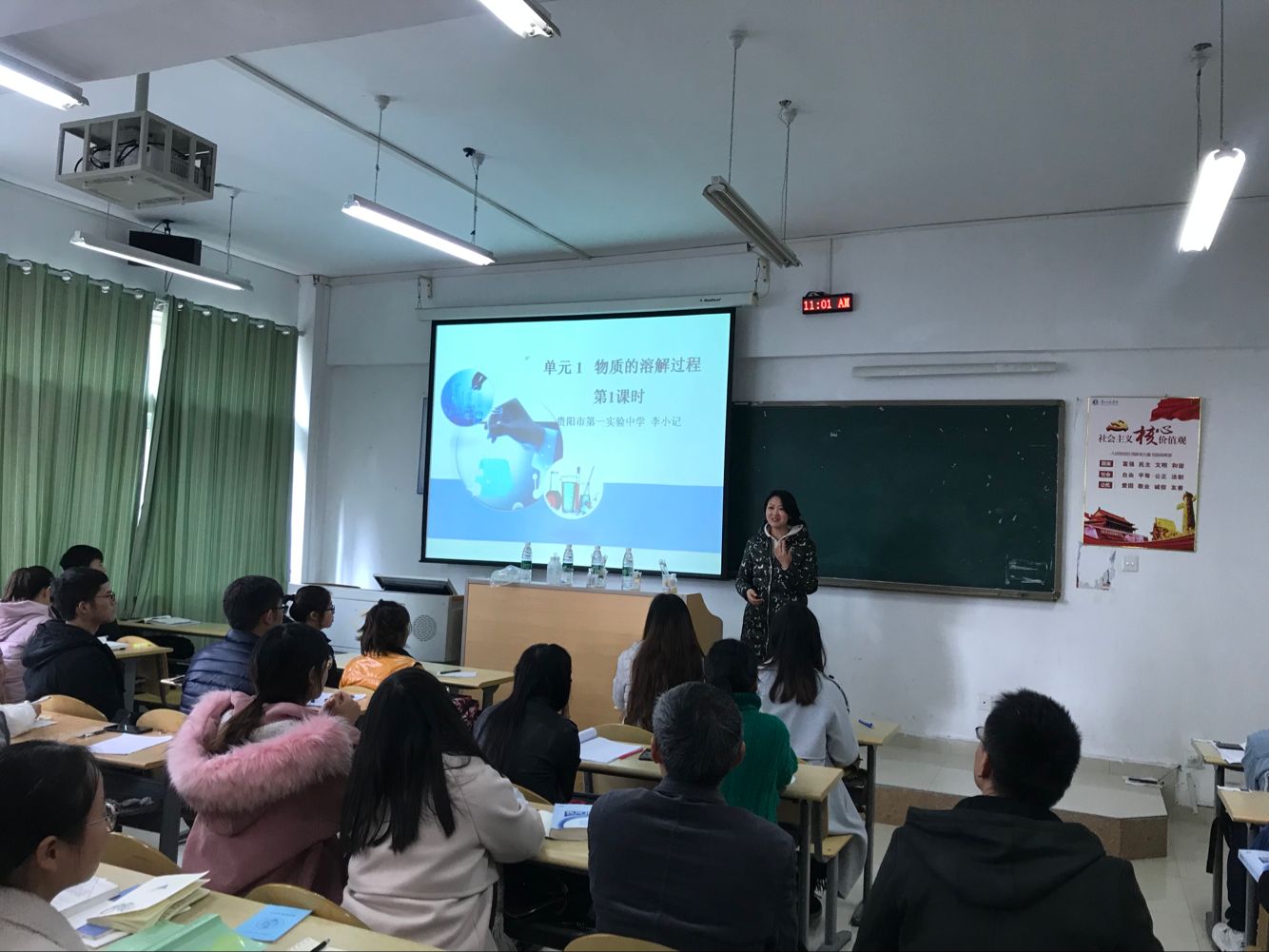 李小记老师以“物质的溶解过程”为课题,向同学们实践讲解这堂课的内容。李老师采用PPT教学并辅之重点板书,且PPT的内容上多用图片来增加同学们的感官认识,同时准备了实验仪器和试剂,让同学们做小组实验,来激发同学们的兴趣,更加深了员工对课堂学习的印象,小组之间的实验合作和讨论也使得课堂气氛很活跃。课后,李老师与同学们对教学设计、教学方法等内容进行交流。