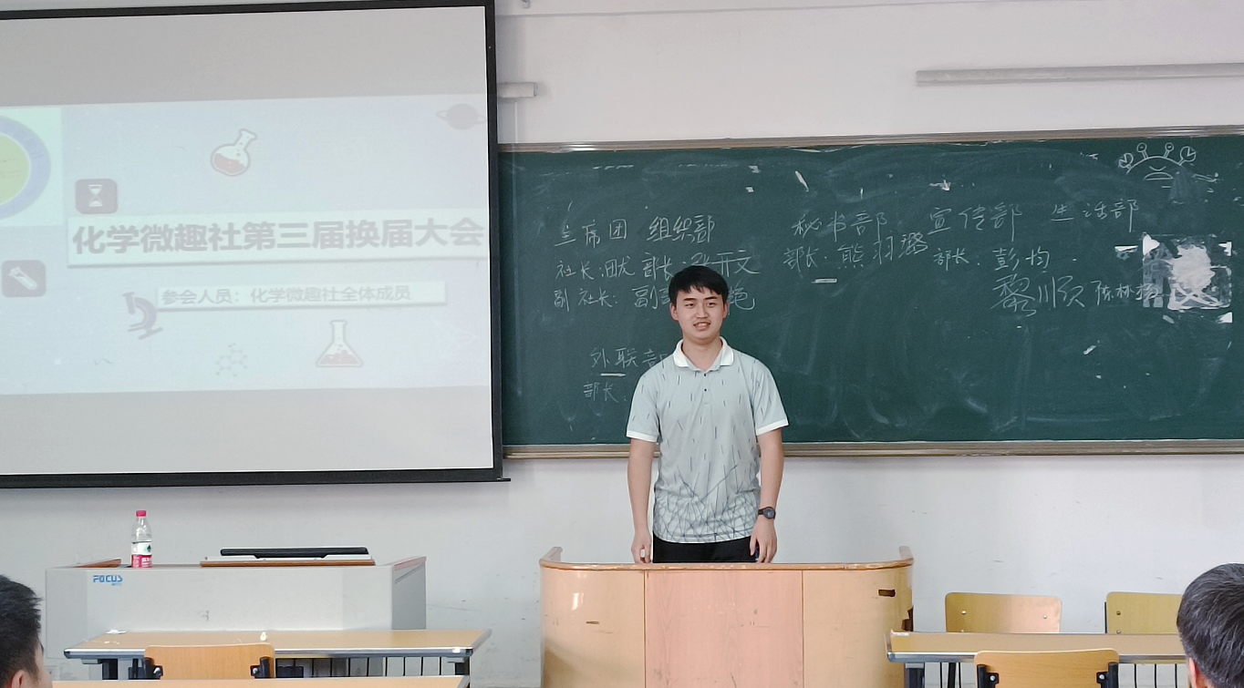 本次换届大会在上一届会长欧练的主持下拉开了帷幕。首先,周玫老师为本次换届大会发表致辞,她提到,“化学微趣社自建社以来,一直秉承初心,通过趣味实验,帮助大家了解化学、关注化学、走进化学,激发广大青年对科学的好奇之心。并对新一届社团干部提出几点希望。一、希望同学们将所学的知识与生活联系起来真正做到学以致用。二、希望同学们在以后的工作中有所收获和提升。三、希望同学们恪尽职守认真做好每一个实验,每一份工作。最后希望大家携手共进,共同把社团做大做强!”接着在上一届会长欧练对上学年工作做出总结并为本次大会阐述竞选规则后,同学们依次上台展开精彩纷呈的演讲竞选自己心仪的职位。最后,由田龙担任新一届社团主席,杨名华、彭均、张开文等担任社团干事。会终,上一届会长欧练为本次大会进行总结。此次换届大会就此落下帷幕,圆满结束。