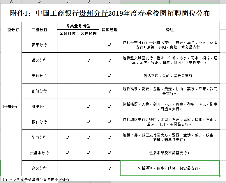 中国工商银行贵州省分行是中国工商银行在黔一级机构,下辖10个二级分行,对外营业网点近300个,从业人员近7000人。近年来,贵州分行在贵州脱贫攻坚中找方位、谋发展,坚持精品银行目标引领,服务本源创造价值,经营效益持续提升,主要财务指标保持同业领先,在工总行综合经营考核中连续保持先进排名,跑出了优秀的工行贵州速度。秉承“以人为本”的管理理念,我们坚持培育“金融工匠”,致力打造专业人才;我们持续完善员工晋升通道,关心关爱员工成长;我们完备薪酬福利体系,不断提升员工获得感;我们着力构建特色文化,各类劳模不断涌现。现诚邀怀揣金融梦想、勇于挑战自我、希冀广阔成长平台的优秀学子加盟,与我们共同留下奋斗的足迹!
