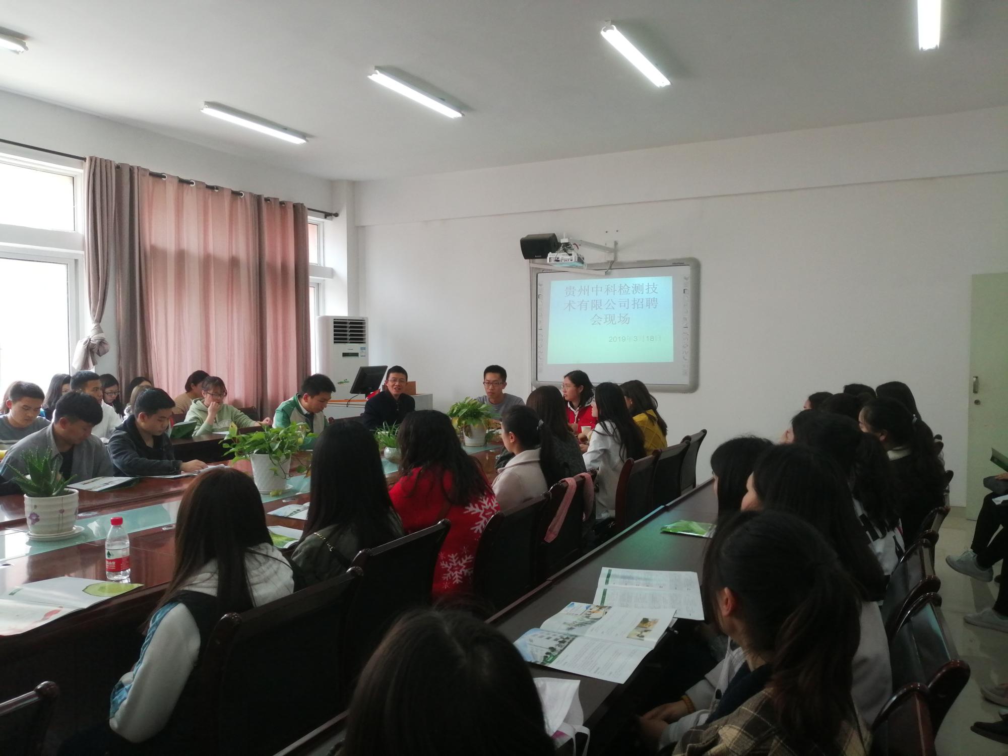 2019年3月18日,贵州中科检测技术有限公司(以下简称“贵州中科”)在宁静楼525会议室为公司2019届毕业生举办了专场招聘宣讲会。“贵州中科”人力资源总监王勋、人力行政专员侯雨、公司党委副书记、经理宋万琚等参加招聘会。公司2019届100多名毕业生积极参与,会场座无虚席。招聘会由公司党委副书记张坤主持。