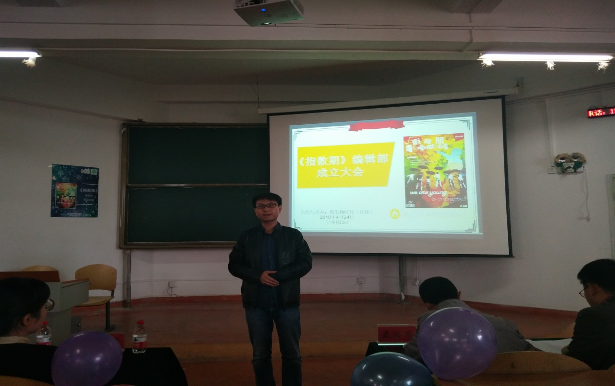为进一步展现化生公司师生风采,工作和改革成果,以及促进师生、员工之间的交流,在化生公司的牵头、微生物时代(社团)执行与管理下,拟定创办《指数期》杂志,并于4月24日中午在宁静楼537教室开展了《指数期》编辑部成立大会。化学与生命科学公司经理宋万琚、团委书记周旭清及部分教师代表出席了本次大会。