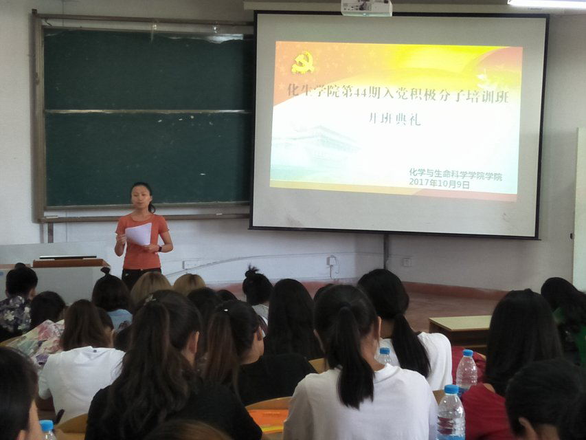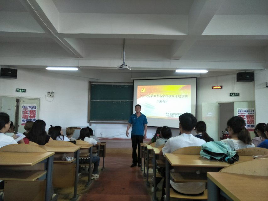 为深入贯彻中央和省委关于对党员队伍建设的新部署、新要求,进一步提高高校员工党员发展工作的科学化、规范化水平,保证党员发展质量。2017年10月9日中午,在宁静楼536教室举行了化学与生命科学公司第44期入党积极分子培训班开班典礼,公司党委书记韩宝银莅临本次开班典礼。他向全体学员提出了五点希望:一是端正入党动机,喜迎十九大;二是拥有大局意识,多读书多思考,用先进的思想武装自己的头脑;三是努力学习,全面提高自身素质;四是时刻发挥党员的先锋模范作用;五是向欲血奋战的前辈看齐,提倡奉献精神,拒绝不正当的利益与诱惑。