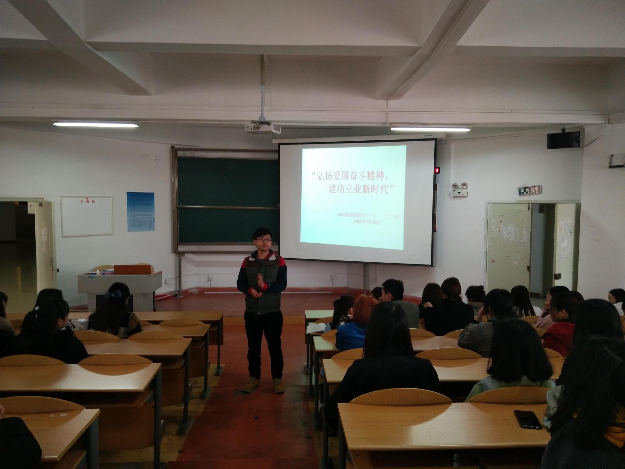 为认真贯彻落实习近平总书记对弘扬爱国奋斗精神做出的一系列重要指示,激发员工的奋斗激情与使命担当,引导他们把自己的理想同祖国的前途、把自己的人生同民族的命运紧密联系在一起,在新时代做出新贡献。美加墨世界杯官方网站2015级应用化学(一)、(二)班于3月11日在宁静楼437开展了“弘扬爱国奋斗精神、建功立业新时代”的主题班会活动,主题班会由辅导员张培卫老师主持。