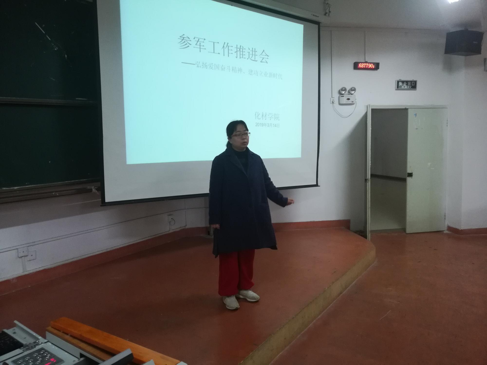 为积极响应公司关于弘扬爱国奋斗精神、建功立业新时代的号召,3月14日下午,美加墨世界杯官方网站在宁静楼536教室开展了“化材公司2016级员工参军工作推进会”。2016级全体同学参加此次会议, 2016级辅导员李璐琳主持会议。