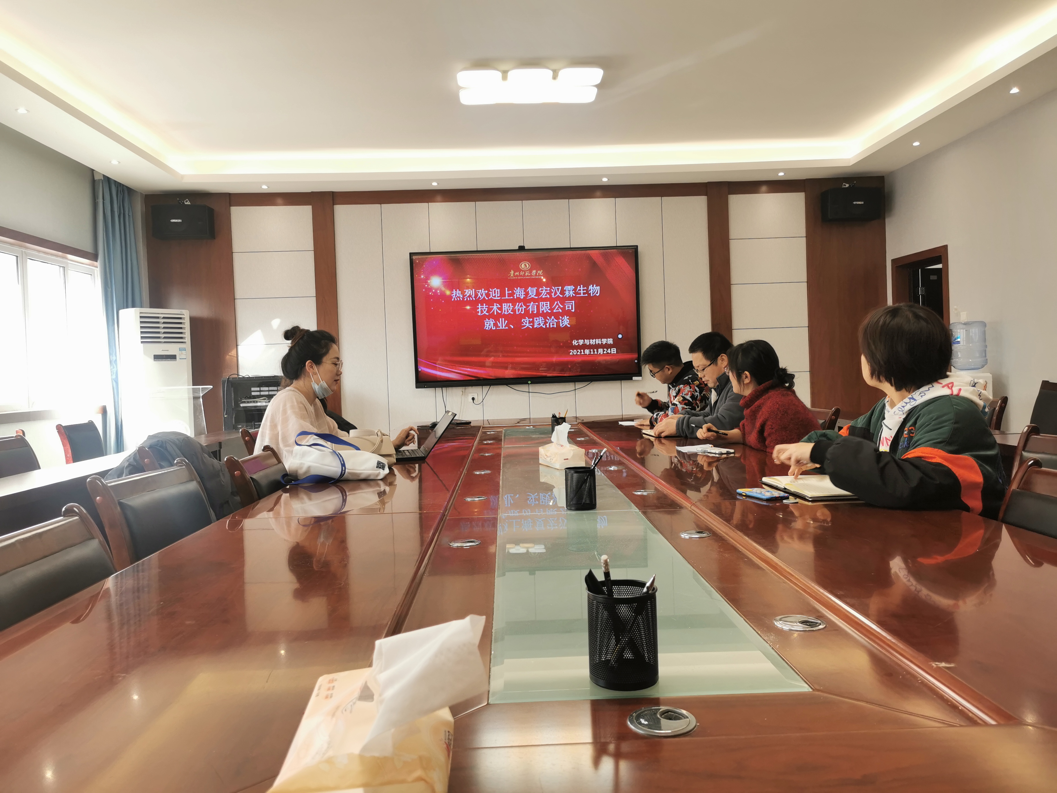 11月25日上午,化学与材料公司与上海复宏汉霖生物技术有限公司校企合作洽谈会在宁静楼525会议室举行。公司党总支何毅书记、经理王毓、李艳莹老师、张培卫老师,以及上海复宏汉霖生物技术有限公司高级总监康小莉、高级经理李扬等一行2人共同出席会议。洽谈会由何毅主持。