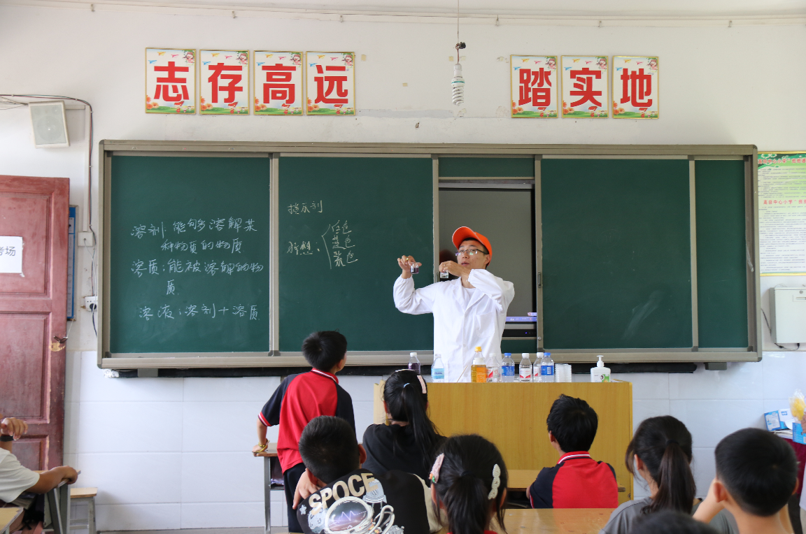 实践队在炎炎烈日之下,从高田村村委会出发,徒步到高田中心小学,走进六年级一班,看到一张张稚嫩的脸上,写满了兴奋,洋溢着好奇,眼神里透出求知欲。实践队成员欧练以提问的方式导入“生活中的化学”知识科普课堂,列举了化学在生活中的应用实例,并应用化学知识直观形象地向小员工解释了生活中的部分现象,例如白糖在热水中溶解的速度要比在冷水中的速度快的原因是因为温度越高,分子的运动越剧烈,所以蔗糖分子在热水中比在冷水中能更快。在讲解完理论知识后,实践队员宋超向小员工演示化学小实验,宋超通过互动,通过颜色变化引导小员工积极的猜想和思考,传递出“大胆假设,小心证实”的基本科学理念。