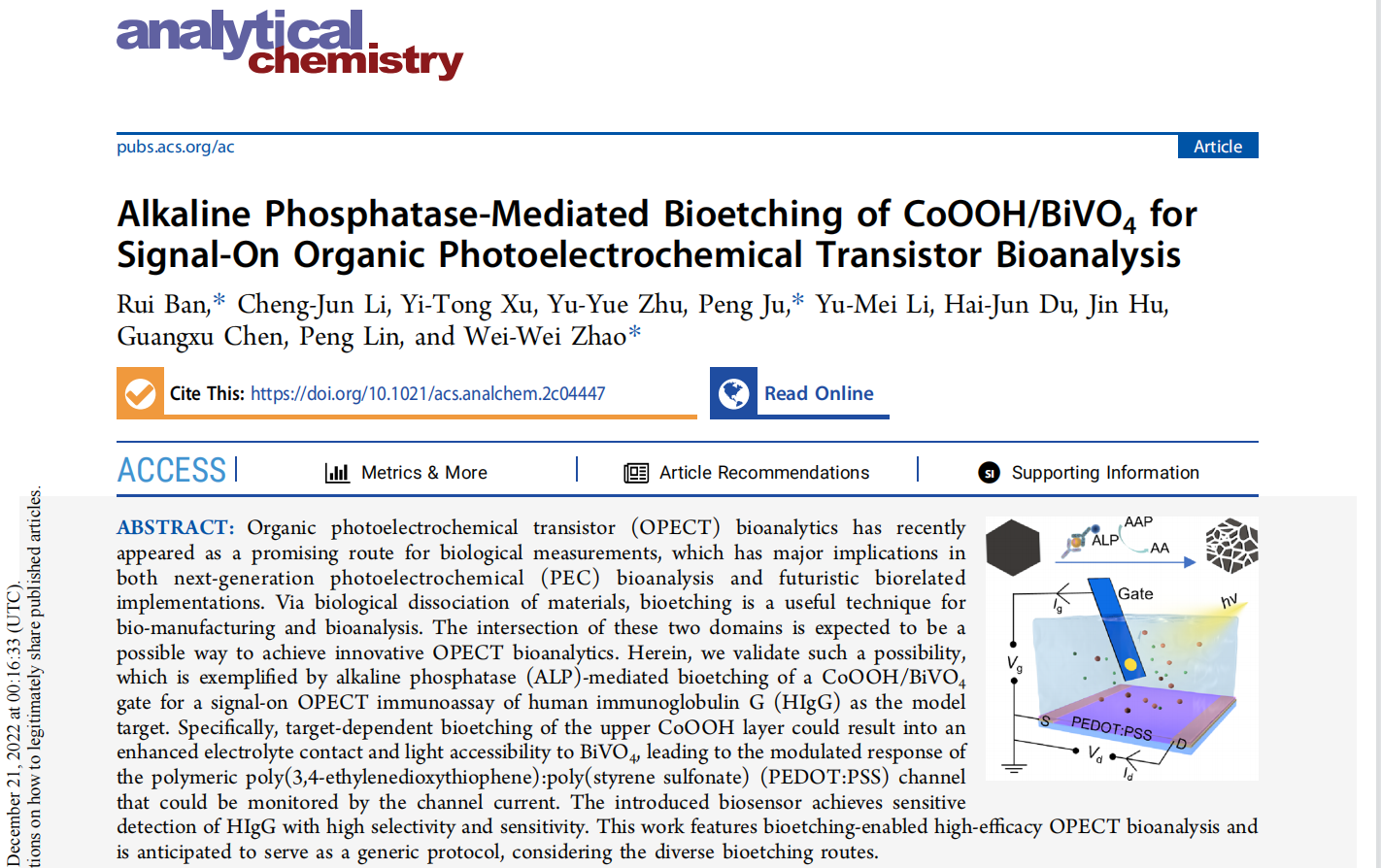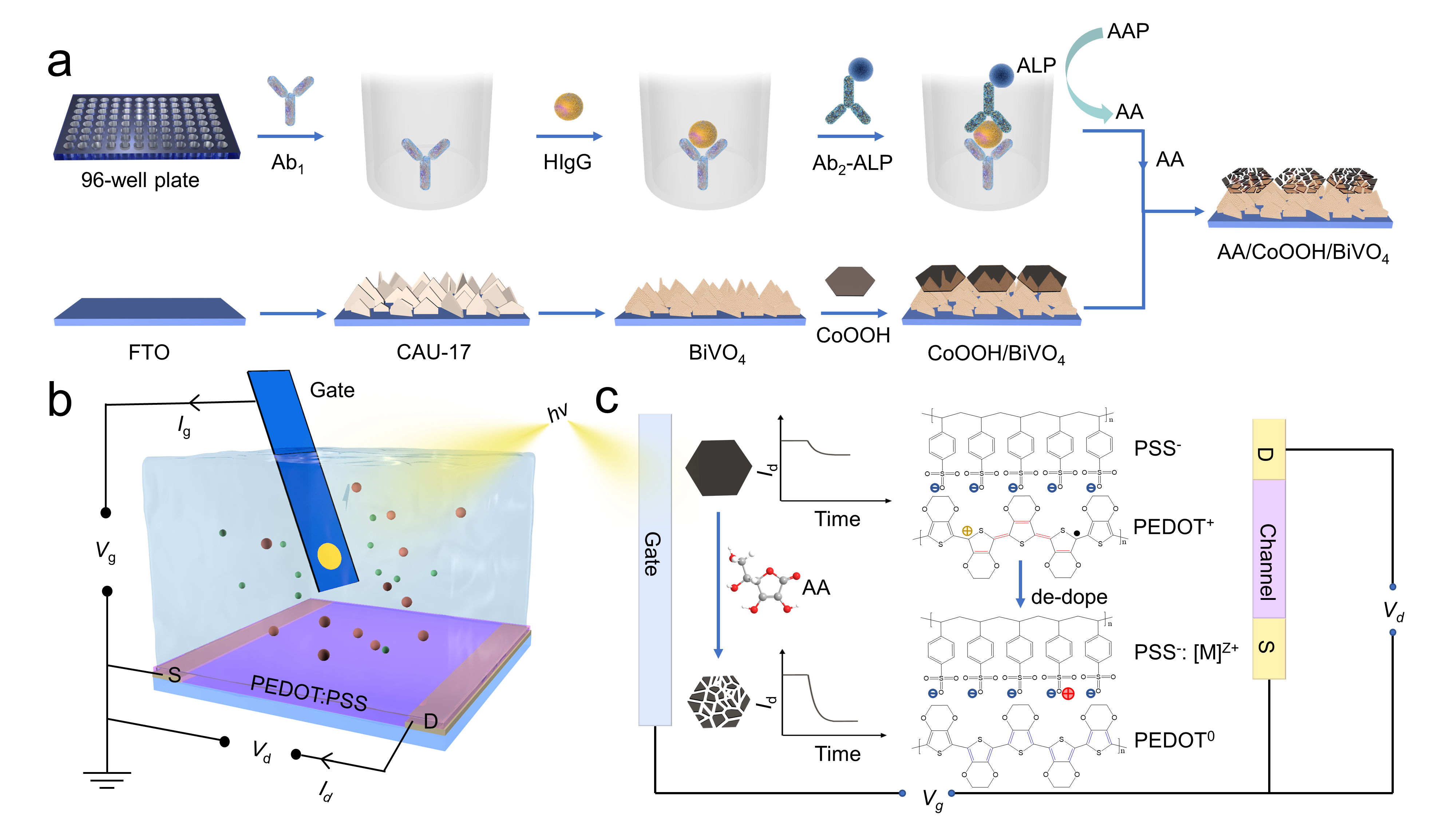 图1. (a) 在96-孔板中ALP标记的夹心免疫过程制备抗坏血酸,用于制备的CoOOH/BiVO4的生物蚀刻,(b) 有机光电化学晶体管结构示意图,(c) 有机光电化学晶体管生物分析调控机制。图片来源:Anal. Chem.