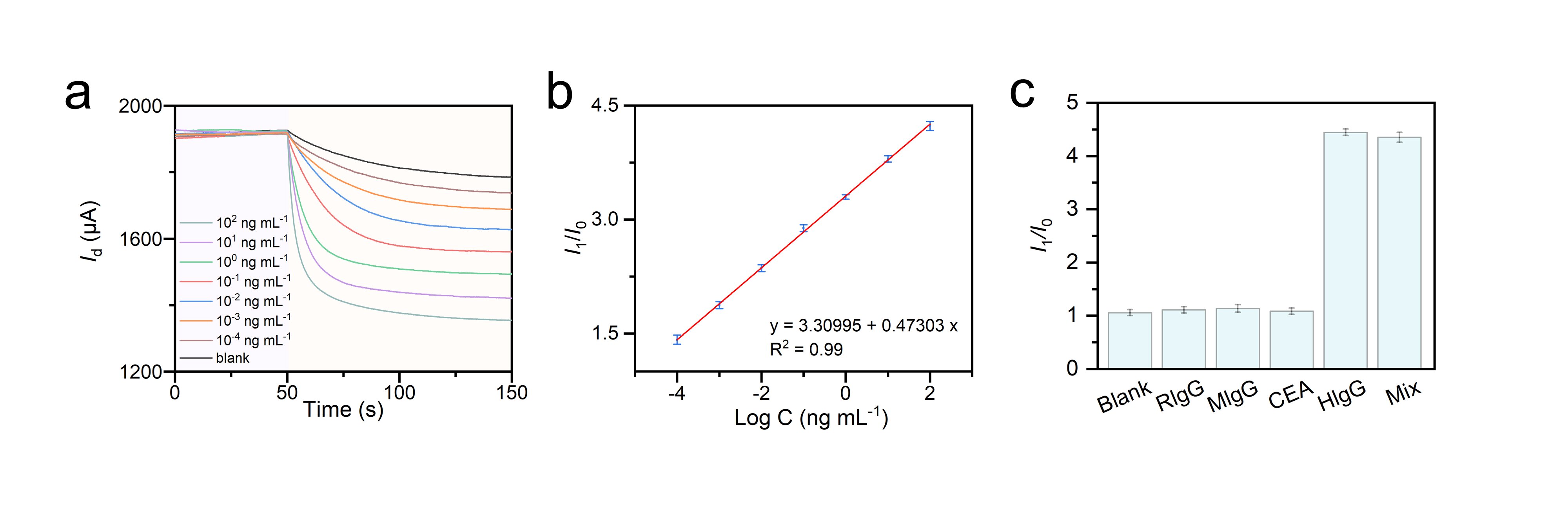 图2. (a) 沟道电流对不同浓度 HIgG 的瞬态响应, (b) 目标物相关的线性回归曲线, (c) 传感器的选择性分析。图片来源:Anal. Chem.
