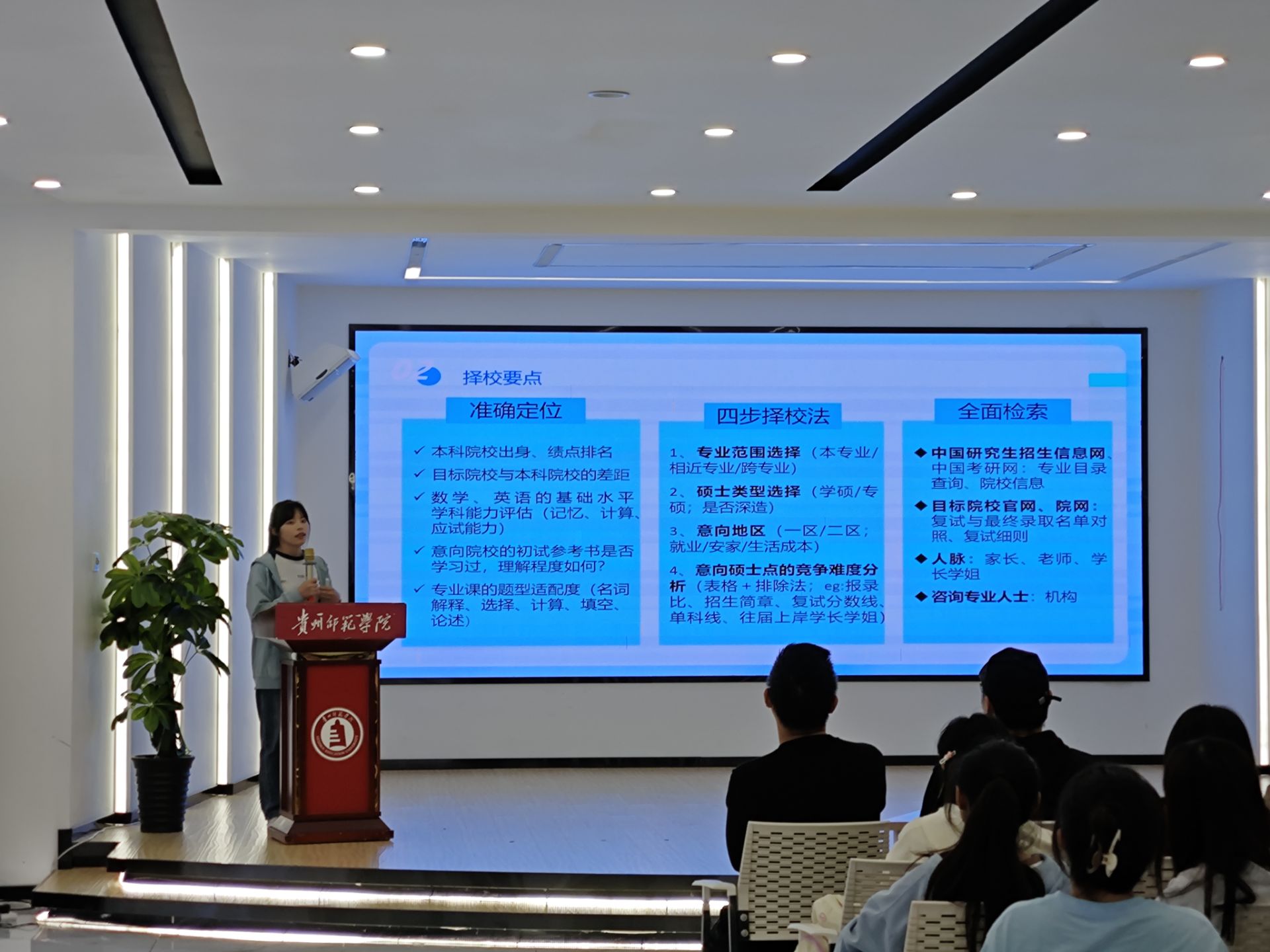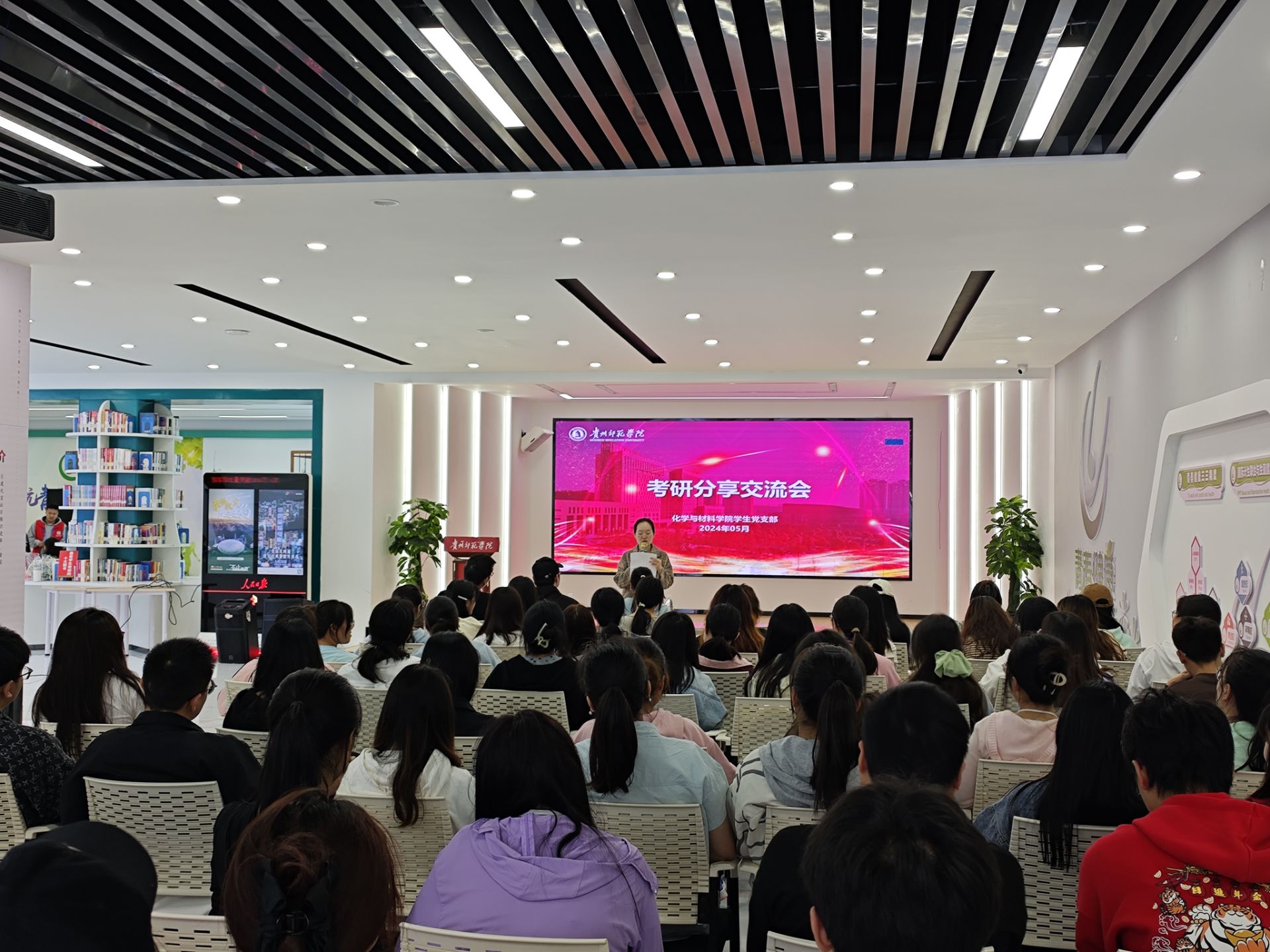 潘小燕从全面检索、准确定位等方面分享了确定目标报考院校的经验,以及英语、政治和专业科目的学习方法。田梦分享了学习信息的搜集和获取渠道,强调了保持良好的心态和稳扎稳打的节奏的重要性。他们的精彩分享引发了现场同学的热烈讨论和思考,为准备考研的同学们指明了前行的方向。李梦杰作总结讲话。她希望同学们汲取经验,顺利考研。