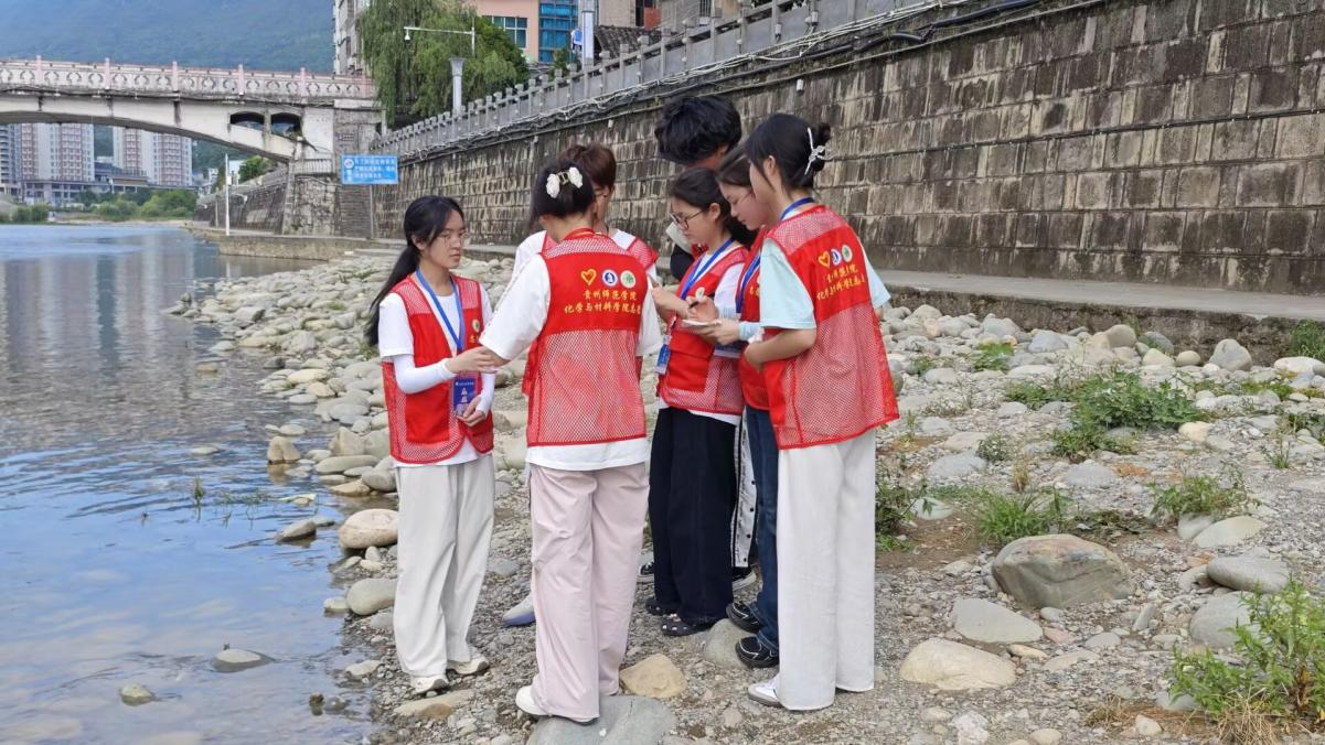 下午四点,团队马不停蹄地前往印江河沿岸,开展水质检测实践。印江河是印江土家族苗族自治县的母亲河,其水质状况与居民生活息息相关,也是团队结合化学专业特色的重要实践内容。队员们携带便携式水质检测仪,在新桥、旧桥及两桥之间三个代表性位点进行检测。经数据汇总分析,检测结果平均值为:水质ppm为65,μs为122,水温为26.1℃。这场结合专业特色的实践,不仅让大家将课堂知识转化为实际能力,更深刻体会到“守护绿水青山”的责任。