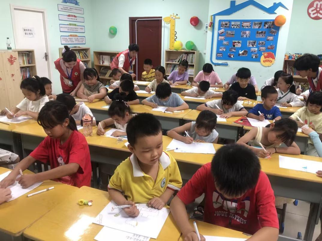 “同学们,今天我们先一起攻克暑假作业里的难题,之后再用画笔描绘心中的家乡,好不好?”实践团队长的一句话,瞬间拉近了与孩子们的距离。课业辅导环节中,面对孩子们提出的数学计算、语文写作、英语阅读等问题,成员们耐心细致地逐一解答,他们用通俗易懂的语言讲解知识点,还结合实例帮助孩子们理解难点。对于学习进度较慢的孩子,志愿者们更是放慢节奏,反复讲解,鼓励他们大胆提问,现场氛围轻松而有序。辅导过程中,队员们不仅关注孩子们的学业问题,更留意他们的情绪状态,对性格内向的孩子主动搭话,用幽默的语言缓解他们的紧张,教室里不时传出阵阵欢笑。