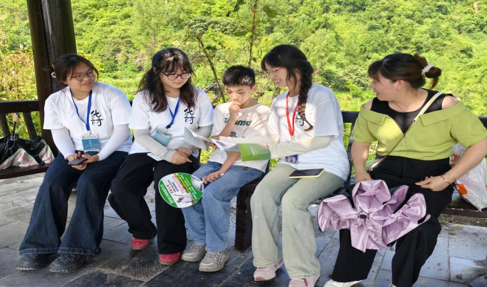 科普团成员踏着晨光前往印江土家族苗族自治县观音沟,一场融合民俗观察与科学传播的实践在此展开。山脚之下,团队兵分两路:一队向往来游客发放调研问卷,了解大众对化学科普的认知需求;另一队则围拢起好奇的孩子们,用通俗语言讲解物质变化原理,让化学知识随山间清风渗入童心。