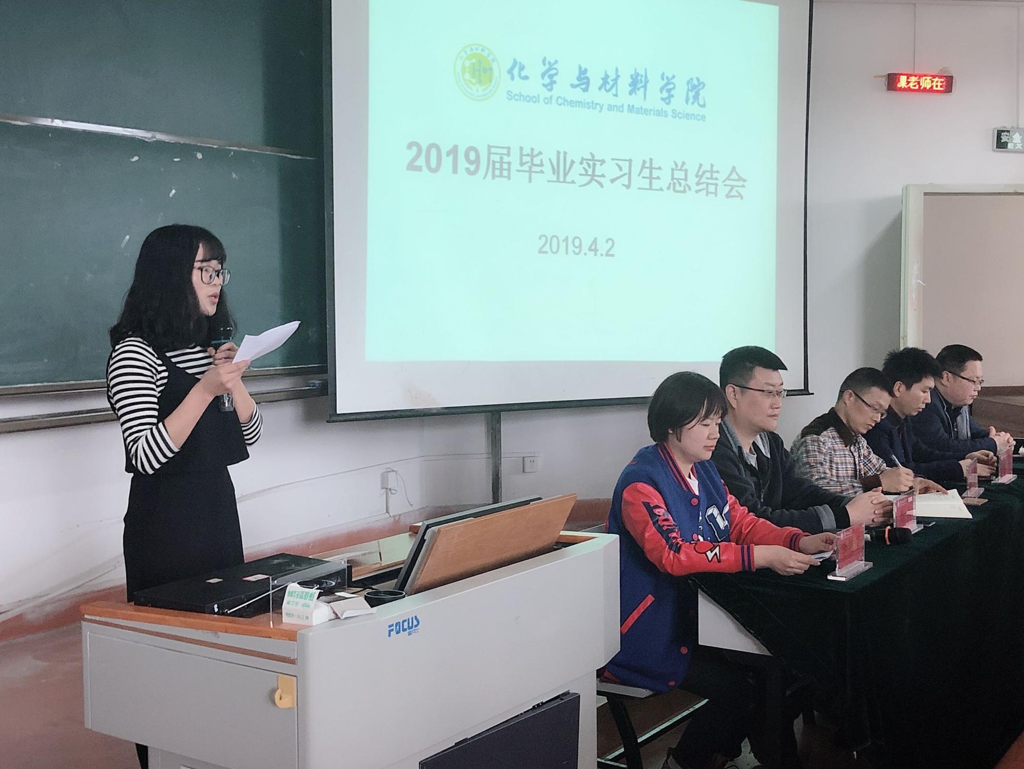 首先由李艳莹对2019届实习工作做了简要总结,祝贺2019届实习生圆满完成实习并有所收获,同时宣读化材料公司2019届实习优秀个人名单。接着,2019届优秀实习生陈甜甜和龚玉琴分别代表化学及应用化学专业做实习发言,分享她们在实习过程中的“酸、甜、苦、辣”和实习感悟,让我们看到了她们的成长,并表达对公司和实习单位的感激之情。吴婕老师在发言中希望同学要持续读好书来丰富自己,并且珍惜在校园的最后时光。
