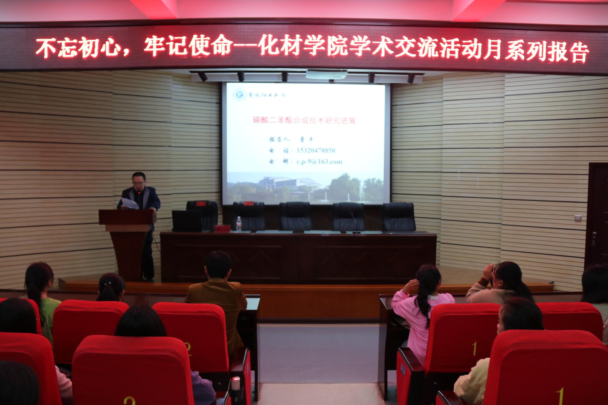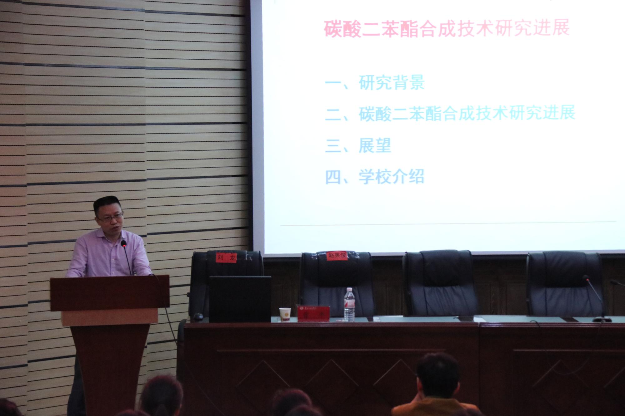 为贯彻“不忘初心、牢记使命”主题教育工作会议精神,扎实推进主题教育往深里走、往心里走、往实里走,进一步开阔员工学术视野,提高公司科学研究的良好氛围。10月23日,美加墨世界杯官方网站于宁静楼150会议室召开《碳酸二苯酯合成技术研究进展》学术讲座,参加此次讲座的有公司2018级化(1)班、化(2)班、应化班、制药工程班部分同学。讲座由重庆理工大学副教授、高级工程师、博士、硕士生导师曹平主讲,公司副经理王毓主持。