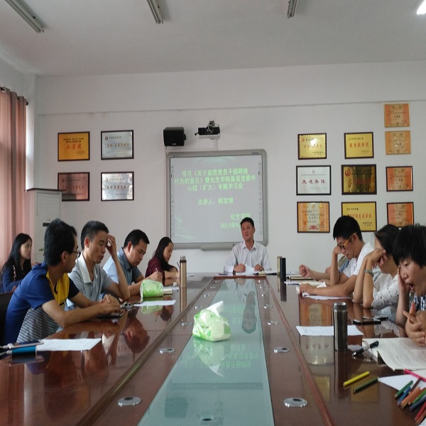 会议上韩宝银宣读了《关于规范党员干部网络行为的意见》,并向全体教工党员做出要求。作为中共党员,必须做好领头作用,尤其是在信息高速发展的时代,网络行为的规范化显得尤为重要,严守政治纪律和政治规矩,不组织、不参与任何诋毁党的网络行为与活动,积极践行社会主义核心价值观。他强调,党员们要时刻记得谨言慎行,且以更高的标准约束自己,为共同营造充满正能量的网络环境而不懈努力。