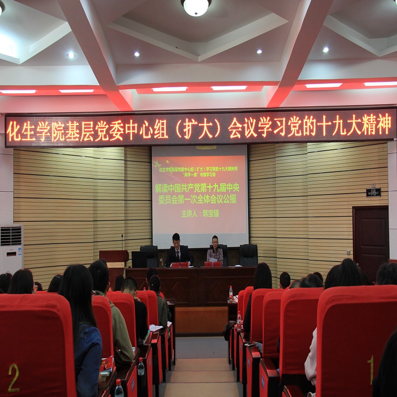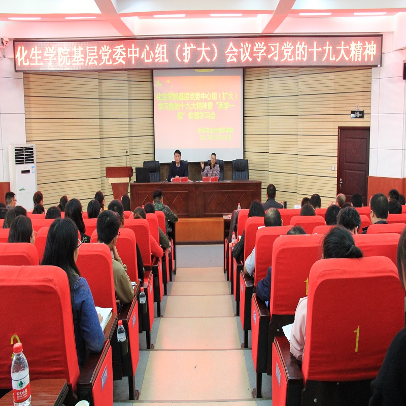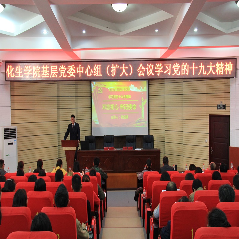 为了深入学习宣传和全面贯彻落实党的十九大精神,进一步激励全院师生不忘初心、牢记使命,坚定信心,焕发精神再出发,加快建设美丽师院。11月10日下午,化生公司在宁静楼150开展化生公司基层党委中心组(扩大)学习党的十九大精神暨“两学一做”学习教育系列专题学习会(一)--学习《党的十九大报告全文》。本次会议由化生公司副经理宋万琚主持。化生公司党委书记韩宝银主讲。参加本次会议的有化生公司全体教职员工、各班班长、团支书、员工党支部委员以及团委员工会代表。