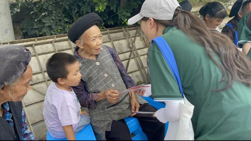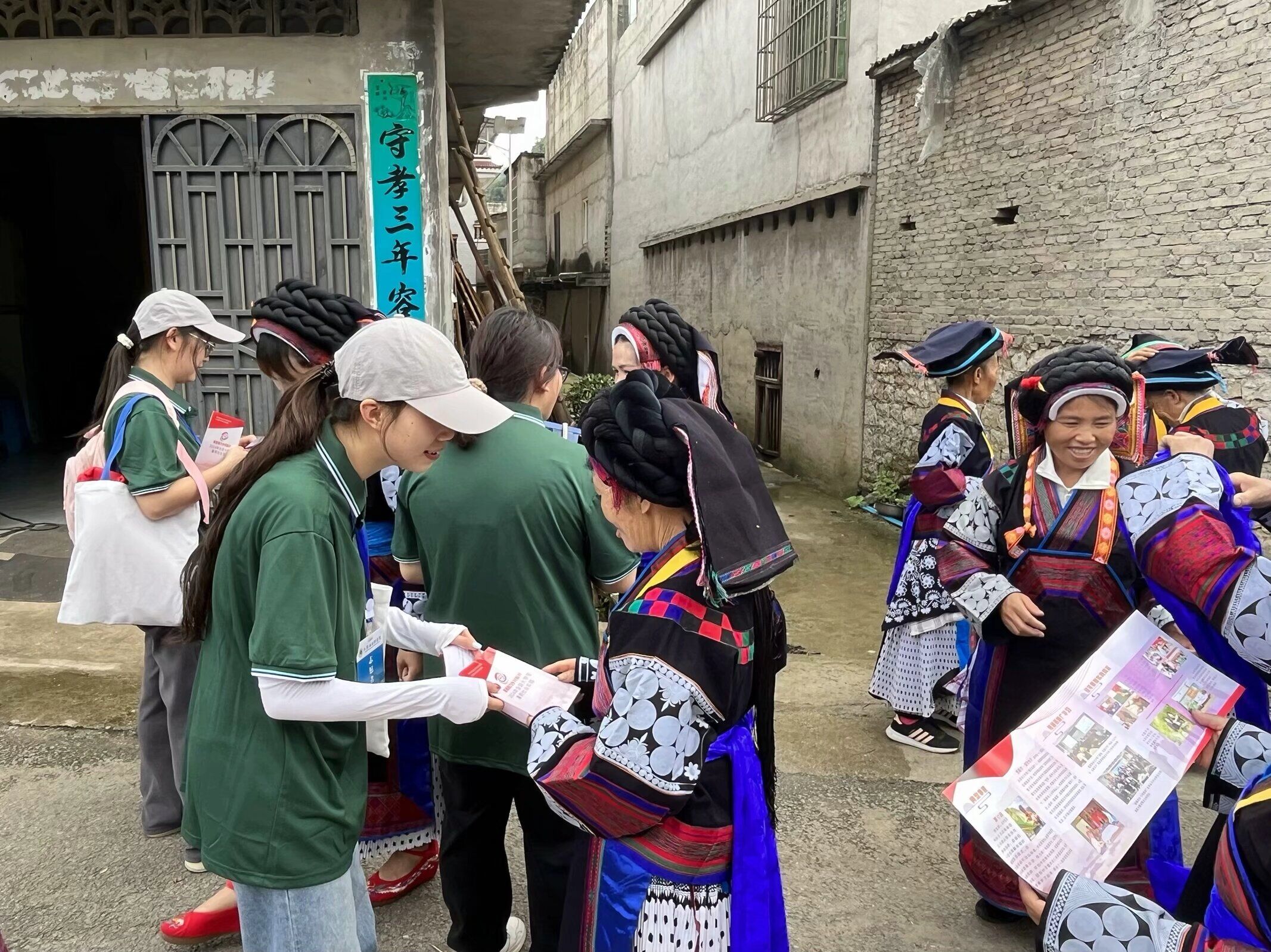 志愿者向石头寨村民发放并讲解推普宣传册