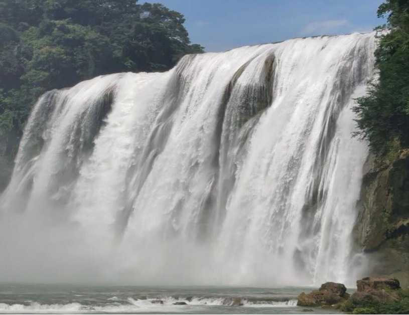 活动当日,实践队经过了漫长的步行抵达黄果树大瀑布,沿着蜿蜒的小径前行,耳边传来的轰鸣声越来越清晰,巨大的水流从高处飞泻而下,撞击在岩石上,溅起漫天的水雾,仿佛整个世界都被这雄浑的力量所笼罩。那震耳欲聋的轰鸣声,仿佛是大自然奏响的宏伟乐章,让人心潮澎湃。