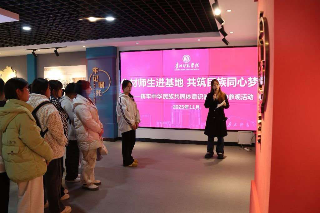 在基地讲解员的引导下,同学们系统学习了中华民族共同体意识的核心要义与时代价值。讲解内容围绕民族团结和爱国主义的主线层层展开,从国家关于民族工作的顶层设计与战略思想,到贵州省在民族团结进步事业中的实践探索,再到乌当区及校内先进典型的感人事迹,全面呈现了各民族交往交流交融的生动图景。讲解中还融入了黔灵英杰的奉献故事、多彩贵州的民族文化魅力,使同学们在回顾历史与关注现实的过程中,深刻体会到“各民族共同团结奋斗、共同繁荣发展”的重大意义,也让铸牢中华民族共同体意识的内涵更加深入人心。