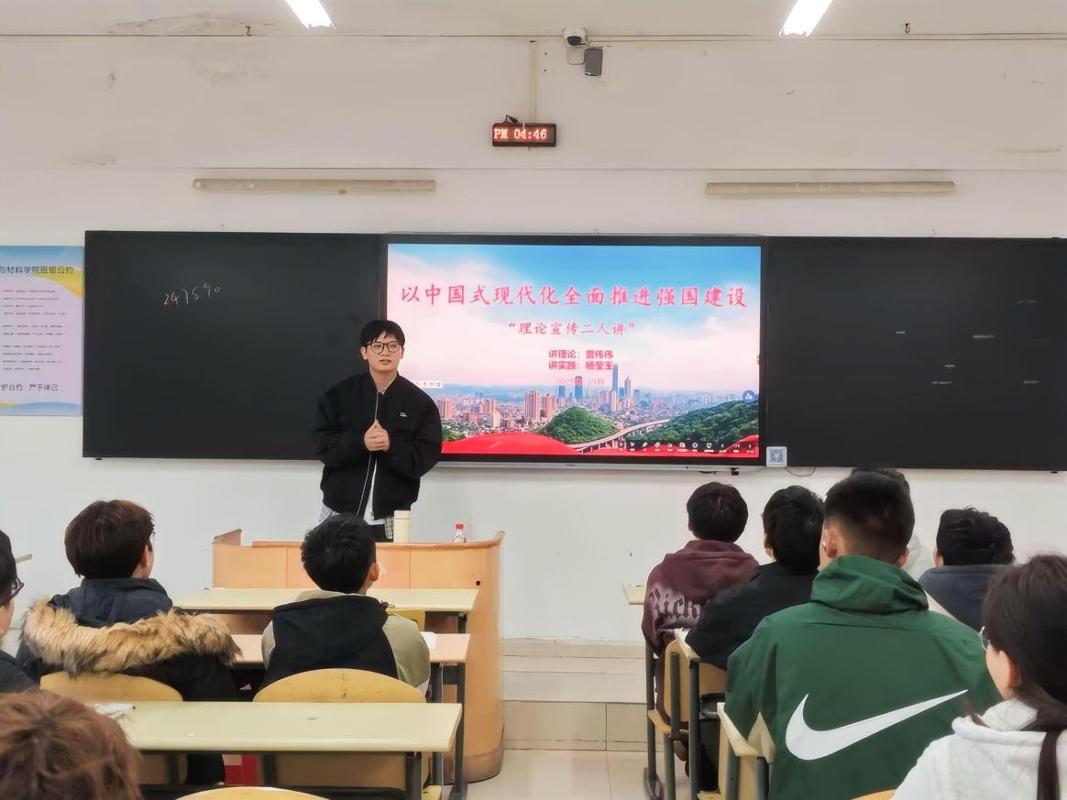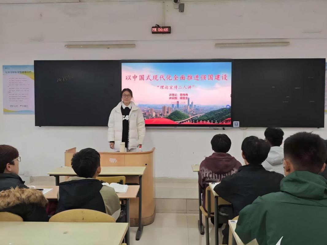 为持续深入学习贯彻习近平总书记关于加强党的作风建设的重要论述和最新重要讲话、重要指示批示精神,系统学习《习近平谈治国理政》第五卷内容,2025年10月24日,美加墨世界杯官方网站在宁静楼528教室举办“以中国式现代化全面推进强国建设”理论宣传二人讲宣讲活动。各班党员代表、入党积极分子代表、员工代表参加活动,公司党委宣传委员曾伟伟、2024级化学班杨莹玉担任主讲。